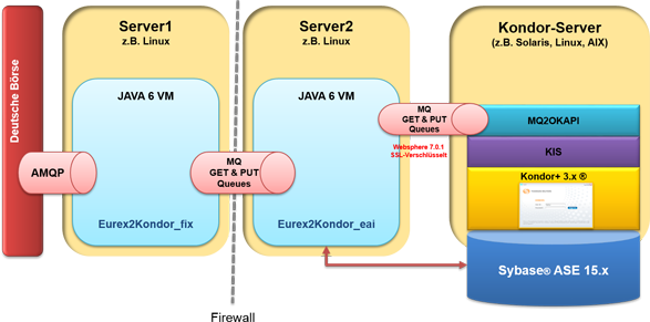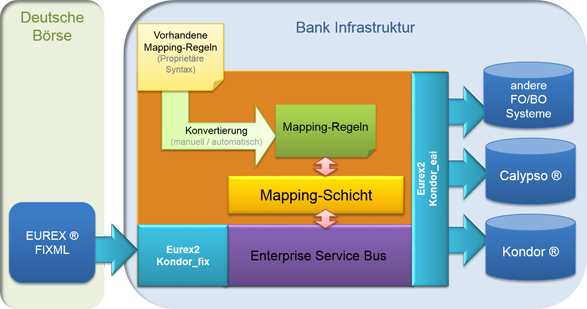Über die Eurex2Kondor_fix Komponente wird der FIXML Datenstream von der Börse automatisch abgeholt und zur weiteren Verarbeitung in eine IBM WebSphere MQ® abgelegt. Die Eurex2Kondor_eai Komponente wiederum holt die Nachrichten ab, filtert die Daten und mappt sie anschließend in ein Kondor+ spezifisches Format. Im Anschluss daran wird die Message als gültiges Geschäft an mq2okapi übergeben. Der kis Client sendet das Ergebnis des Imports an die Eurex2Kondor_eai Komponente zurück.