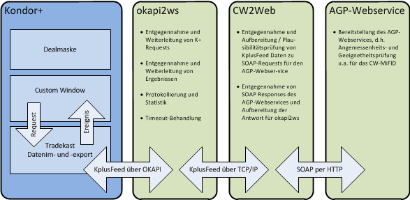 Der okapi2ws Adapter bildet den Vermittler zwischen einem Kondor+ System und dem CW2Web-Service Adapter. okapi2ws wird in Kondor+ über ein Custom Window mit entsprechenden Anzeigefeldern und Request-Schaltern nutzbar gemacht. Als Datenformat der zwischen Kondor+ und dem Dienst ausgetauschten Nachrichten wird das Kondor+ interne KplusFeed Format verwendet. Die Kommunikation zwischen dem okapi2ws Adapter und dem externen Dienst verwendet das TCP/IP Protokoll.